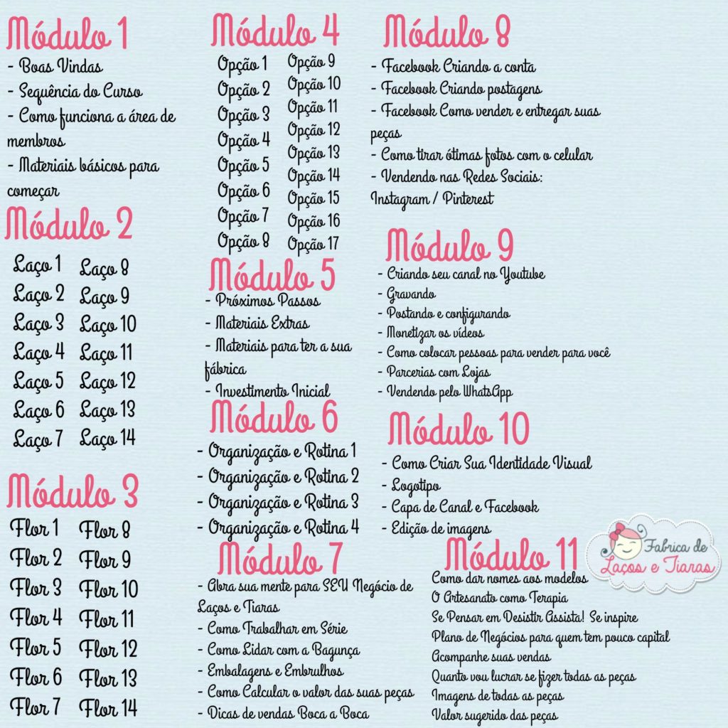 É isso mesmo, você vai conseguir montar a sua fábrica de laços e tiaras em casa começando do zero! O curso tem uma metodologia simples, que ensina o passo a passo para você fabricar as peças e criar um negócio sólido.